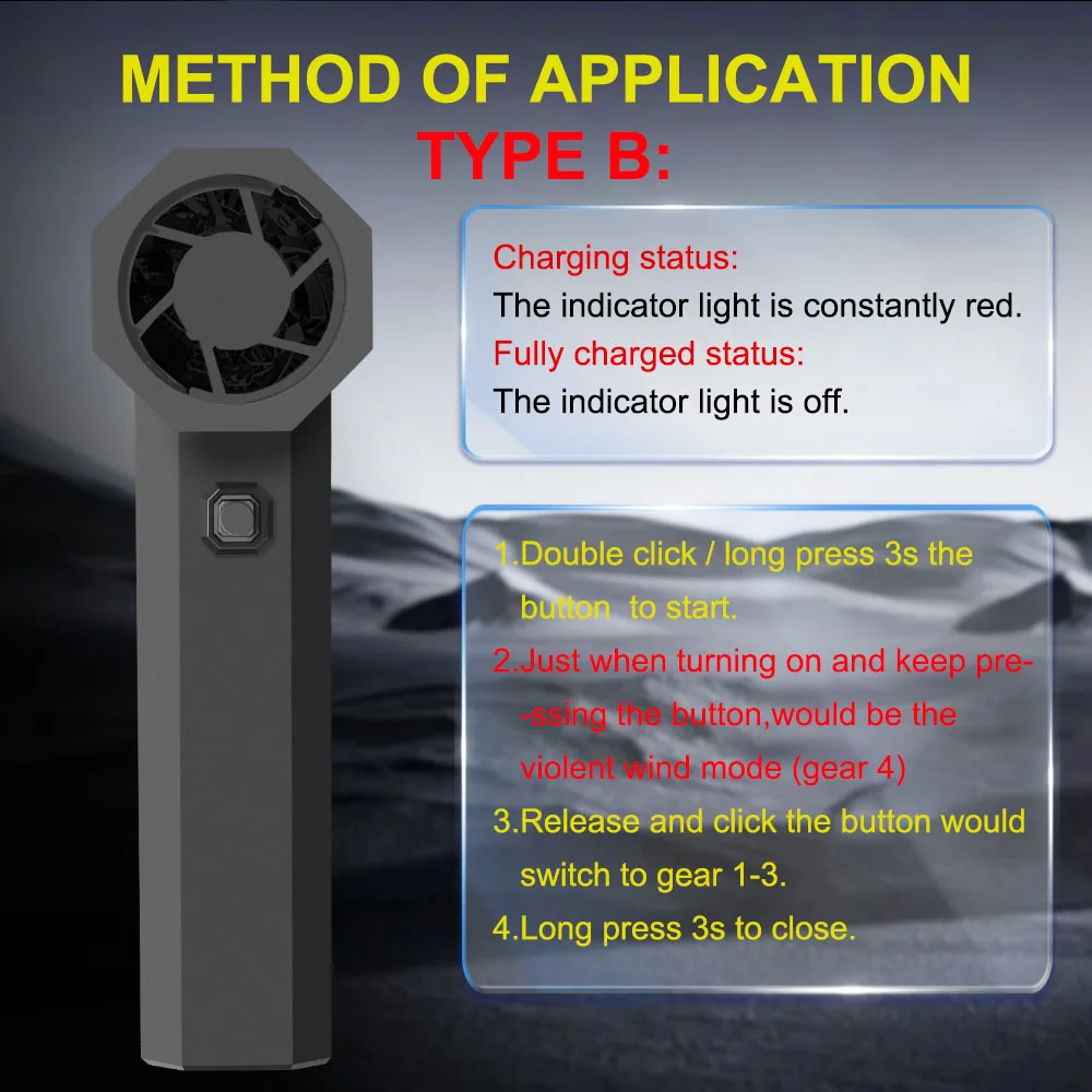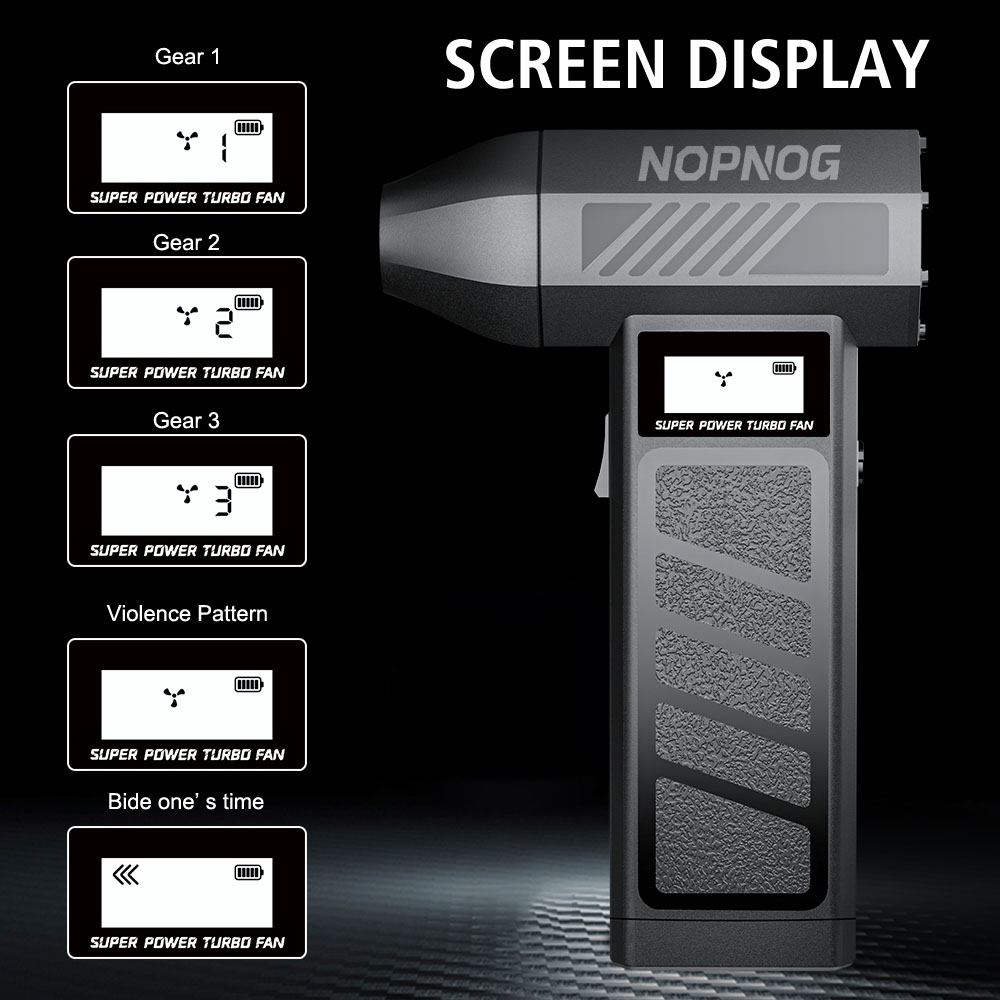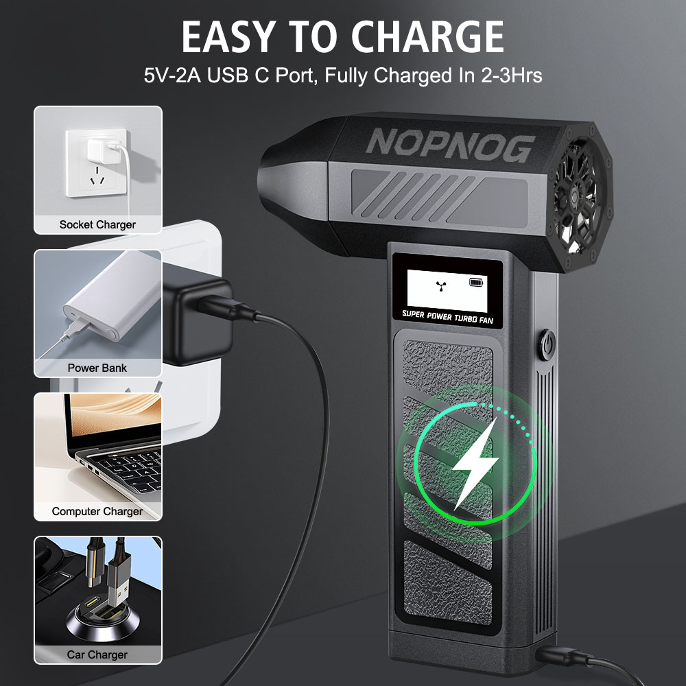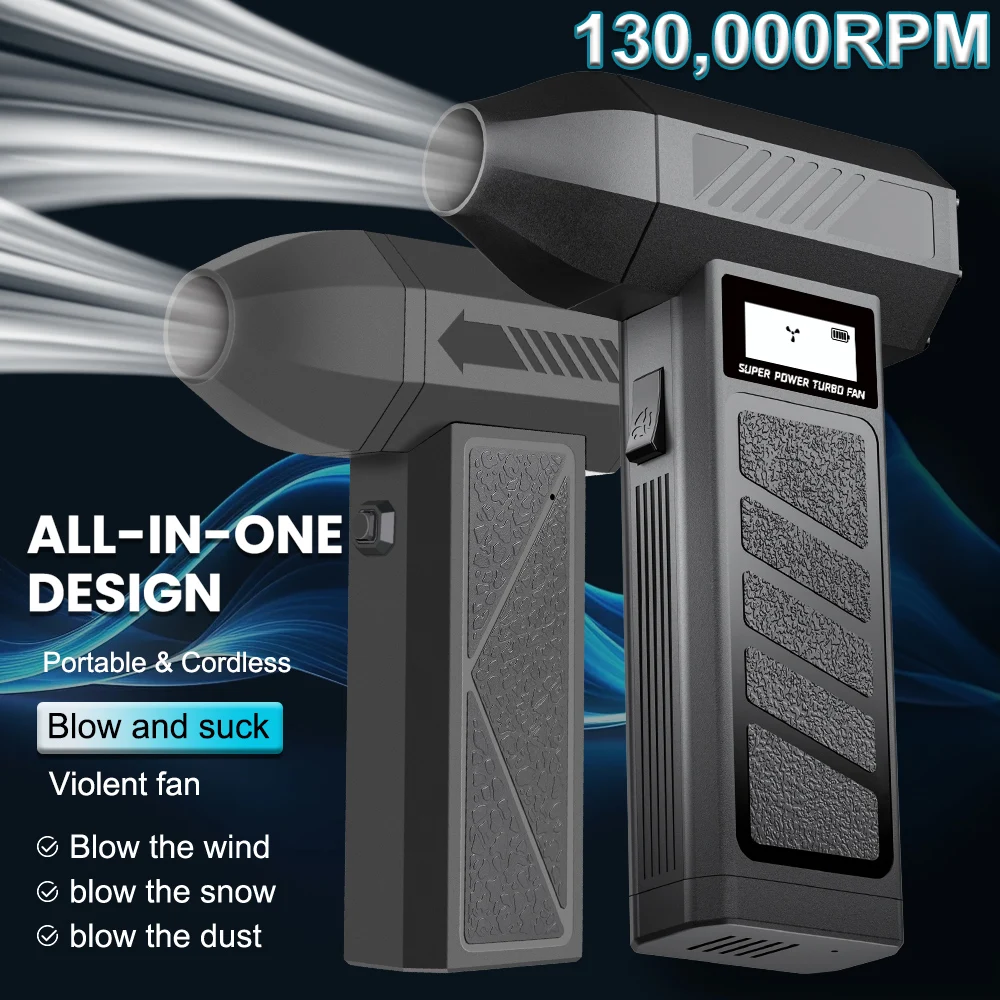 Easy to use operation:Knob stepless speed regulationThe user-friendly design of portable turbo fans ensures easy functionality. In addition, the charging board also has safe and reliable charging protection and overheating protection functions. The internal brushless motor can achieve high speeds of up to 130000 RPM (revolutions per minute).